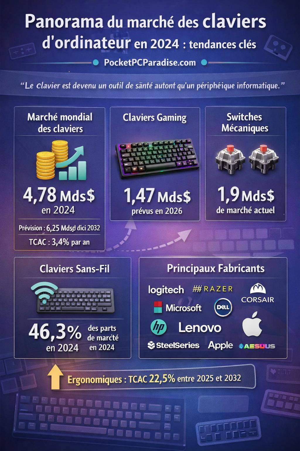 Le marché mondial des claviers d’ordinateur pèse environ 4,78 milliards de dollars en 2024 et se dirige vers 6,25 milliards de dollars d’ici 2032, avec un taux de croissance annuel moyen (TCAC) d’environ 3,4 %. Cette progression s’explique par la montée en puissance du télétravail, du gaming, de la création de contenu et des besoins en ergonomie au bureau.